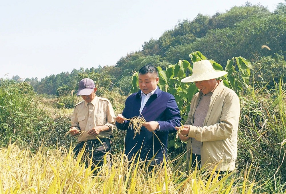 甘启斌(中)与种粮农户查看水稻生长情况。(陈婷 摄)