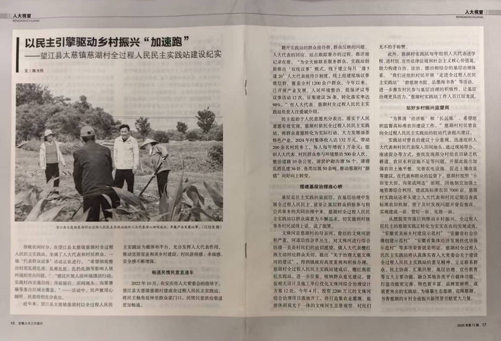2022年10月,在安庆市人大常委会的指导下,望江县太慈镇慈湖村建成全过程人民民主实践站,将民主触角延伸至群众家门口,民情民意供给渠道更加畅通。
