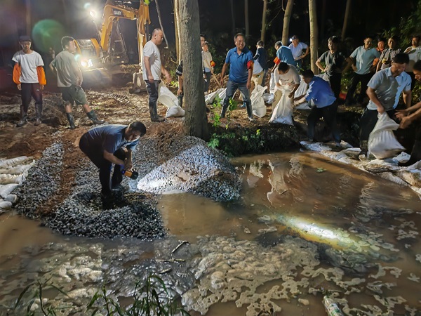 险情就是命令,责任重于泰山。24小时待命的雷池镇防汛突击队与水利工程技术人员火速集结,直奔险情发生地。此时,管涌已初现端倪,浊水与泥沙交织,情况危急。面对汹涌的管涌,水利局工程技术专家迅速介入,凭借专业知识与丰富经验,准确探查了鼓沙水流,确定了管涌的具体位置,并果断决定采用导滤压浸技术进行处置。与此同时,人大代表们身先士卒,与突击队员和闻讯赶来的群众并肩作战。他们忙着搬运沙袋、碎石,积极应对,控制险情。