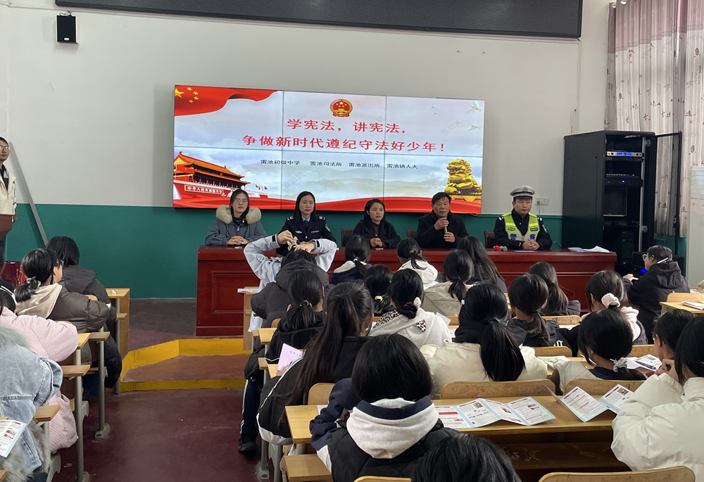 为进一步普及法律知识,提升青少年学生自护能力,营造安全、健康的成长环境。12月4日,雷池镇人大联合司法所、综治办、派出所、卫健办等部门到雷池初级中学开展了一场主题为“法润芳华,守护成长”的法治安全防护专题讲座。